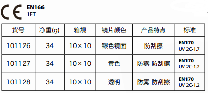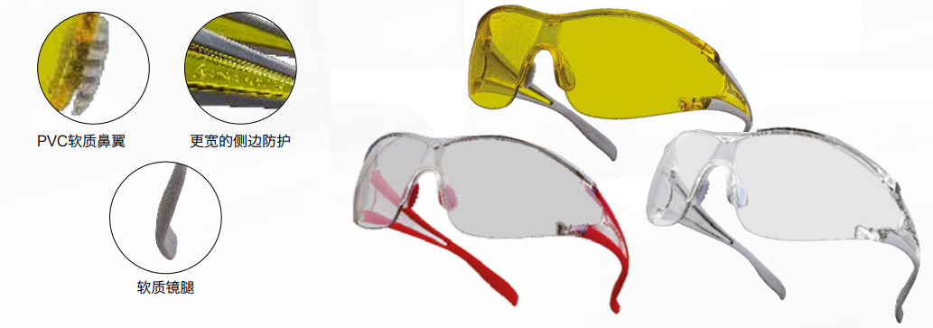 時(shí)尚全貼面圓弧款防護(hù)眼鏡,眉?jí)|及柔軟鼻梁架,確保佩戴舒適。聚碳酸酯鏡片,有效防護(hù)沖擊危害,阻隔99%紫外線,透明/黃色/鏡面三款針對(duì)不同亮度,防護(hù)各種強(qiáng)度的光線。