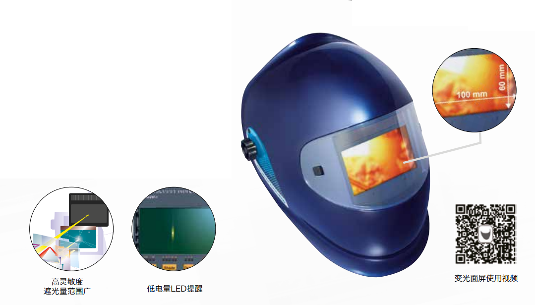 自動(dòng)變光電焊面屏,PC鏡片,帶有吸汗帶,棘輪式可調(diào)節(jié)頭帶,太陽(yáng)能充電功能,可替換電池。100 x 60毫米。