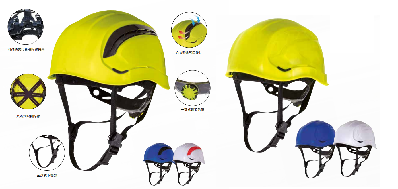 透氣型運動頭盔,ABS材質帽殼,專業無帽檐,視野更寬廣,織物內襯,獨特三點式吸汗下顎帶,側面特殊Arc型透氣口,排汗散熱更快捷。旋鈕式后箍調節,使用更方便。產品標配高空作業下顎帶。
