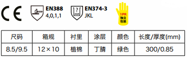 高端款丁腈防護手套,采用新型涂層技術,形成有效屏障,最大防護各種化學品的傷害,同時耐磨與抗刺穿性能都大于同類丁腈手套,并擁有良好的熱保護性能。手掌部位菱形花崗石紋理防滑結構,強化手套濕性物體的抓握力。棉針織物內襯,吸汗性能優異,能長時間保持手部干爽。 適用于機械及金屬加工業、制藥業、石油化工業等復雜化學油性環境。
