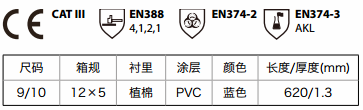 超長袖口PVC包覆棉襯里手套,100%無縫針織棉襯里,優(yōu)質(zhì)PVC涂層,在化學環(huán)境下提供有效防護,對絕大多數(shù)酸、堿、油有極強的耐受性能。手套尾端彈性熱焊接超長光滑袖口,尾部彈性收緊,便于穿戴,同時為流出的化學液體提供有效防護屏障,避免漏入手臂。舒適無縫植棉襯里,有效提高手套抗磨損性能,并提供優(yōu)異的舒適保障。