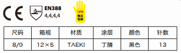 半丁腈涂層防切割手套,TAEKI防切割纖維,半丁腈涂層,對(duì)切割和毛刺具有優(yōu)秀的防護(hù)能力,尤為適合廣泛的組裝應(yīng)用環(huán)境,實(shí)現(xiàn)生產(chǎn)率最大化與安全防護(hù)兼顧。在油性環(huán)境擁有良好的抓握性,舒適透氣。 適用于機(jī)械維護(hù),金屬、玻璃加工,建筑業(yè)。