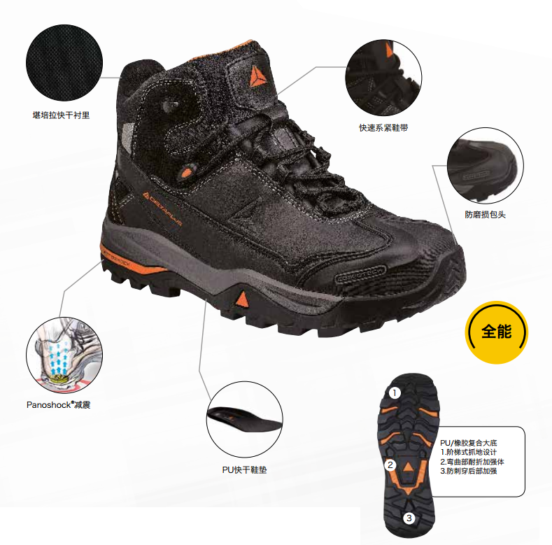 TREKWORK系列S3全牛皮高幫安全鞋,頭層進口牛皮鞋面,柔軟舒適,聚酰胺吸濕襯里,可脫卸預成型聚酯纖維EVA鞋墊,粘合PU中底帶Panoshock?減震材料,橡膠大底,非金屬合成材料保護包頭和防刺穿中底,防砸、防刺穿、防靜電、后跟減震、耐磨、耐油、耐酸堿、SRC級防滑、耐250℃高溫、耐寒。