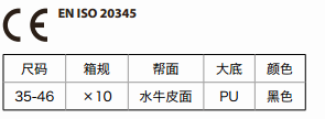 印度水牛皮鞋面,皮革厚度大于2.0毫米,新型高品質雙密度PU注塑鞋底,SRC級防滑,輕便舒適。基本功能:防砸、耐磨、耐油,后跟吸能。
