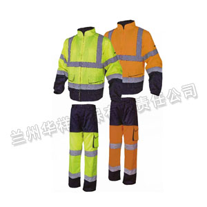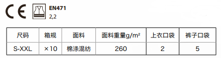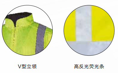兩件套熒光夾克,54%棉46%滌,260g/m2,松緊袖口, 反光等級2級,黑黃高亮警戒色,條紋狀設(shè)計提高視覺沖擊,有效起到熒光警示作用,適合室內(nèi)外多種天氣穿著。 顏色:JM-黃色+藏青色 OM-橙色+藏青色
