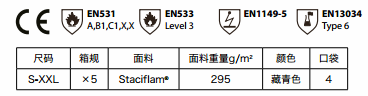 高端分體式三防服夾克,55% Staciflam? FR聚丙烯腈纖維和45% 棉以及1% 防靜電碳纖維混合織造。下翻式立領兩側帶紐扣,插肩袖,兩側松緊褲腰(2×16厘米)。1個內部口袋和1個獨立的手機袋,2個外部口袋,口袋均帶有上遮蓋布。 可以防護意外與火焰短暫接觸帶來的危害燒傷及熱侵害,同時阻隔傳導熱和輻射熱。可防護輕微的化學物質液體飛濺,同時具備防靜電功能。 295g/m2,上下分體,舒適耐用,是石油化工,加油站,氣站等工作人員的最佳選擇。