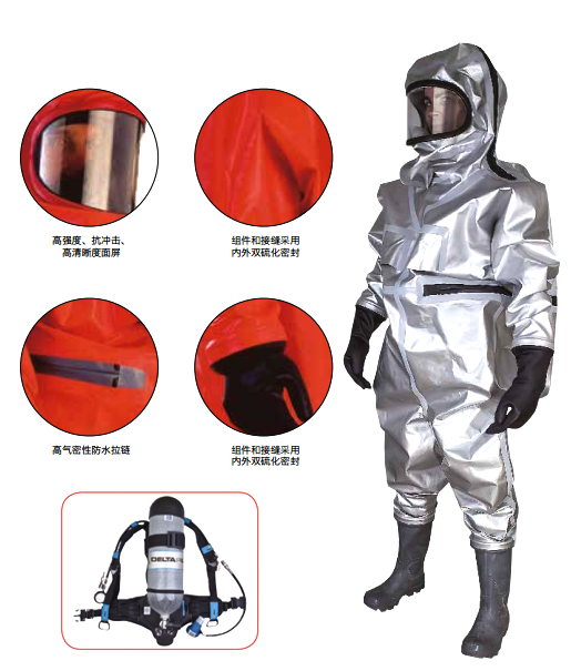 聚酯纖維+雙面CSM Hypalon涂層、組件和接縫采用內/外部雙硫化密封。高氣密性防水拉鏈。較高強度、抗沖擊、高清晰度面屏。胸前和腿部配置4毫巴排氣閥門,抗多種高濃度化學試劑滲透長達8小時以上。卓越的防酸堿性能,防火阻燃,耐UV/臭氧、抗曲繞龜裂、耐磨、防霧、防固體顆粒。配一體式防化手套、防化靴。