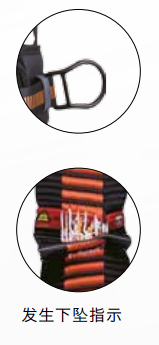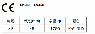 雙調兩掛點含定位腰帶安全帶,配有胸前、背部雙掛點和腰部定位點,腰帶能120°旋轉便于調用4個工具環上的物件。橙/灰雙色橫條高強度織帶,肩部配有Riplight波型減壓調節扣,左肩胛部配有下墜指示器,黑色超大型連接環。