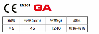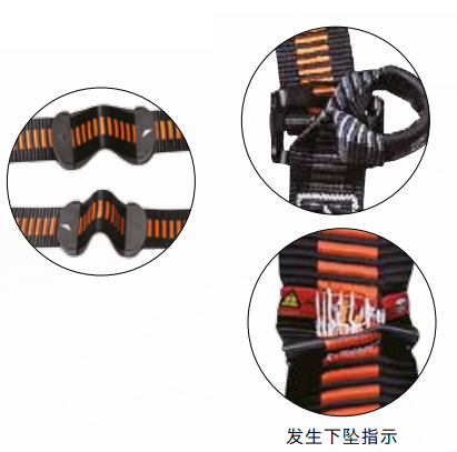 雙調三掛點安全帶,配有2個前側爬梯掛點和1個背部掛點,橙/灰雙色橫條高強度織帶,肩部配有Riplight波型減壓調節扣,左肩胛部配有下墜指示器,黑色超大型連接環。HAR23胸部加強扣環。